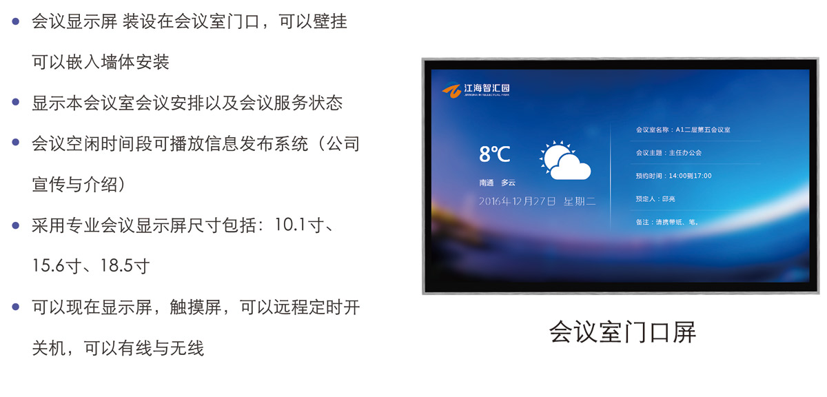 1:在會議室門口按照會議顯示屏,顯示會議室所有預定和服務信息